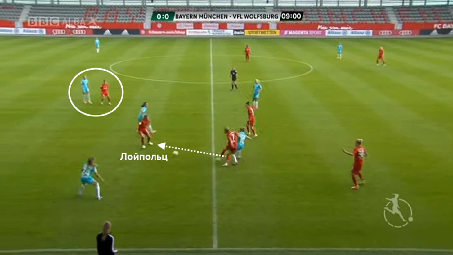 Лойпольц классно двигается без мяча, оценивает ситуацию вокруг, не паникует под давлением и отлично играет в пас (это ещё не всё – подробно разбирали здесь), поэтому «Вольфсбург» видел в ней особую опасность. Это часто выливалось в то, что другие соперники получали свободу.