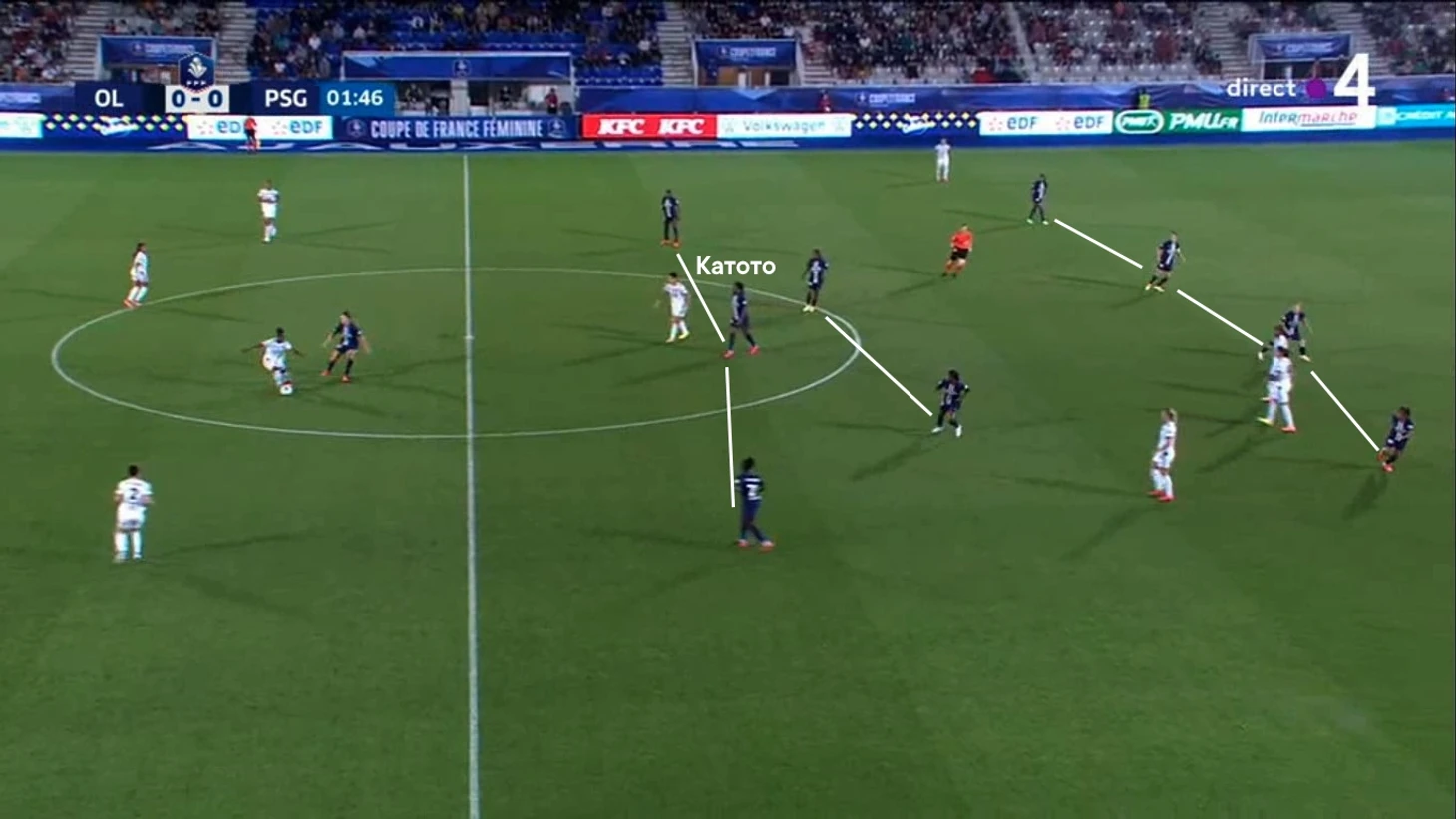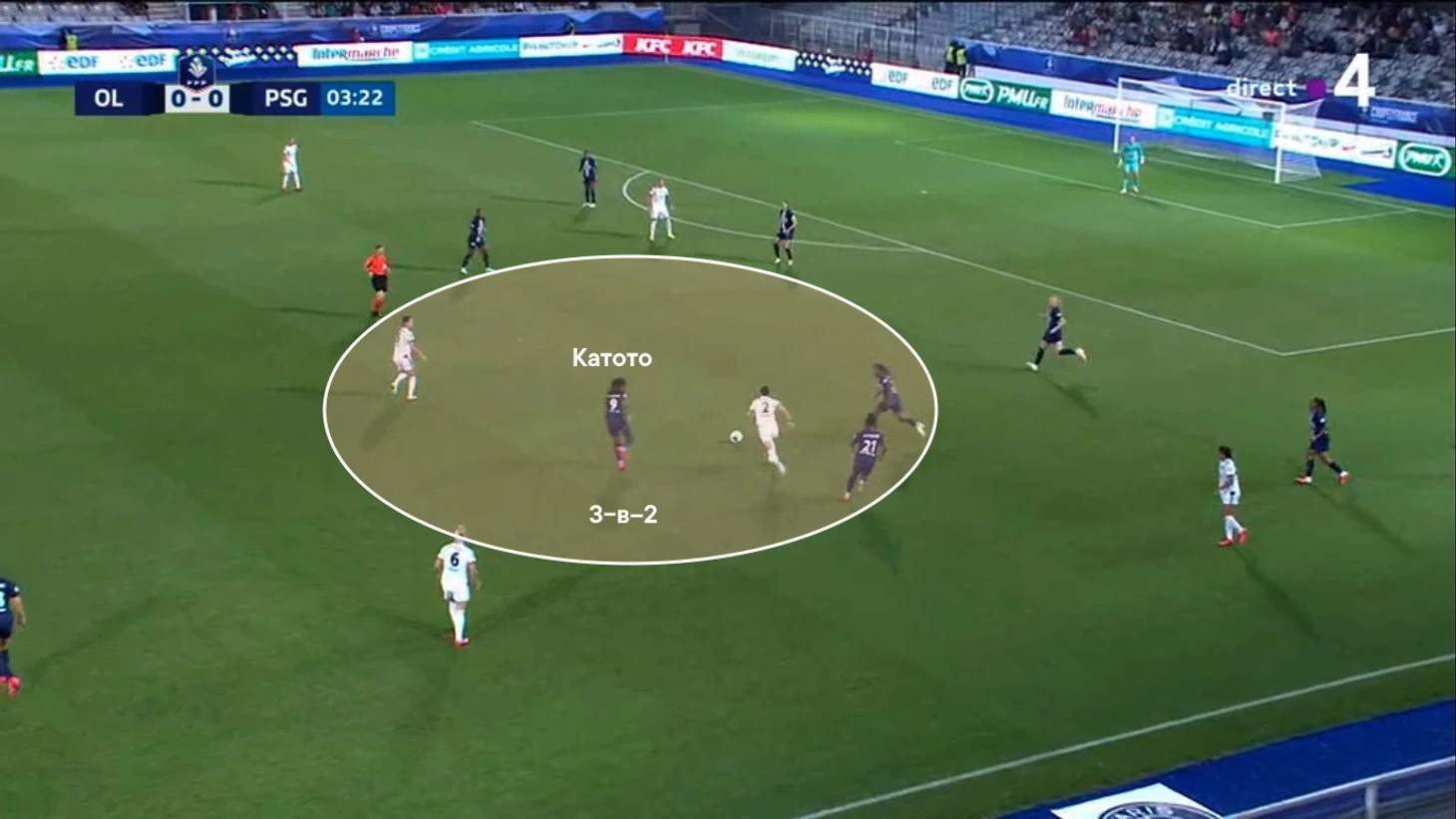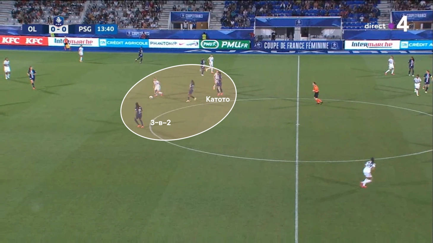 Движение Катото имело очень важное значение при игре ПСЖ без мяча. Она опускалась в опорную зону соперника, чтобы создавать численное преимущество. Такой план хорошо работал, потому что никто из защитников «Лиона» не поднимался за нападающей, которая здорово действует в отборе. Из-за этого номинальные хозяева часто теряли мяч в центре: