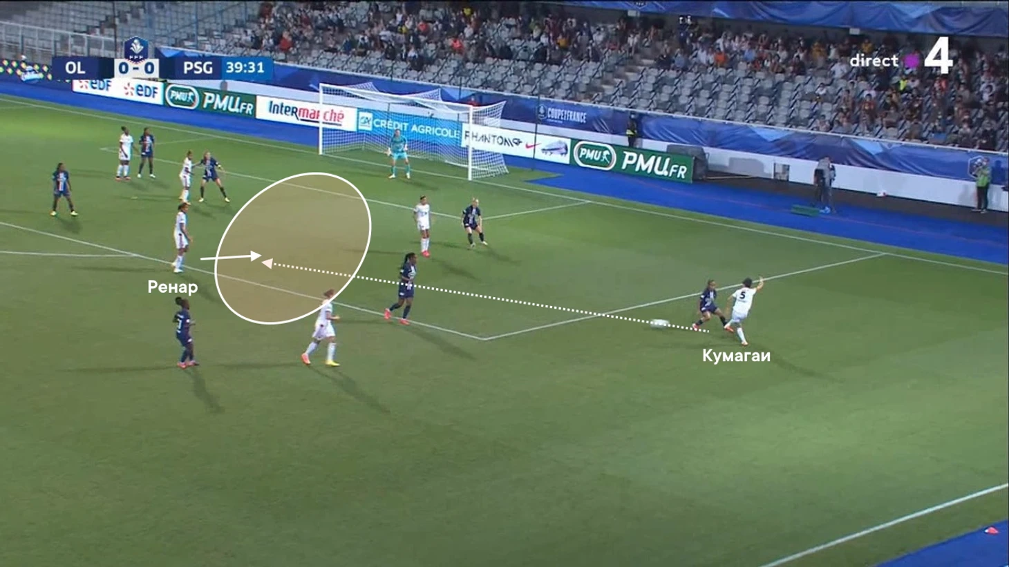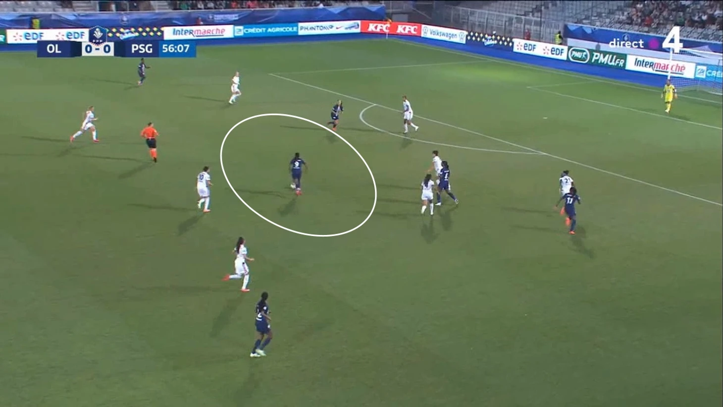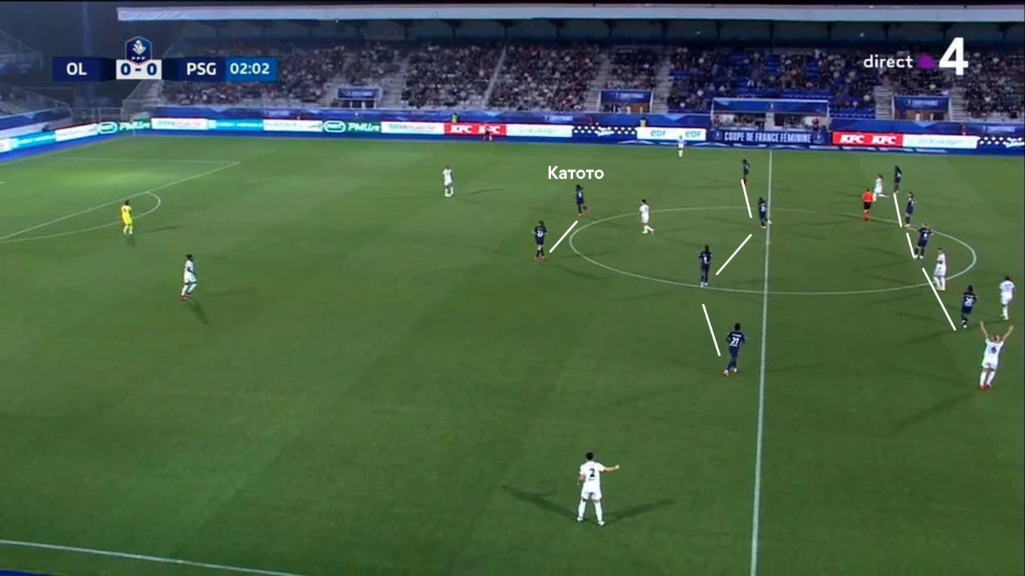 Движение Катото имело очень важное значение при игре ПСЖ без мяча. Она опускалась в опорную зону соперника, чтобы создавать численное преимущество. Такой план хорошо работал, потому что никто из защитников «Лиона» не поднимался за нападающей, которая здорово действует в отборе. Из-за этого номинальные хозяева часто теряли мяч в центре:
