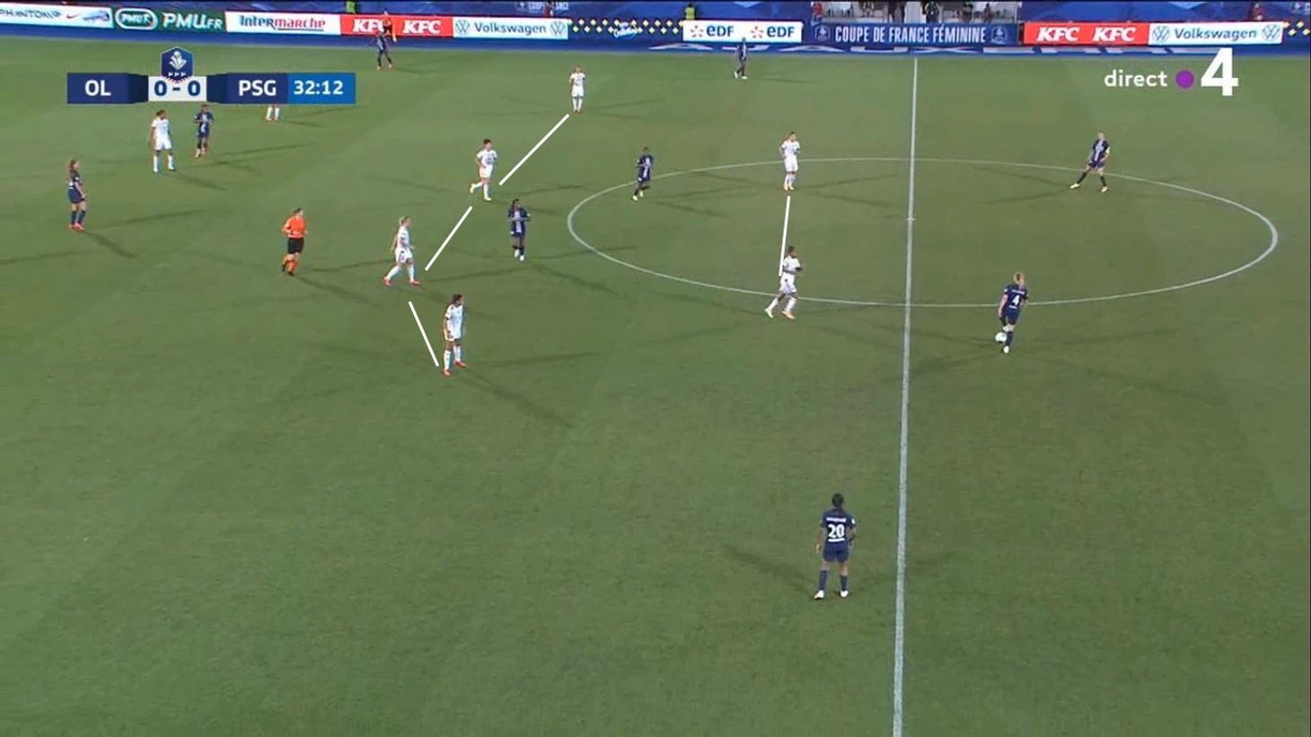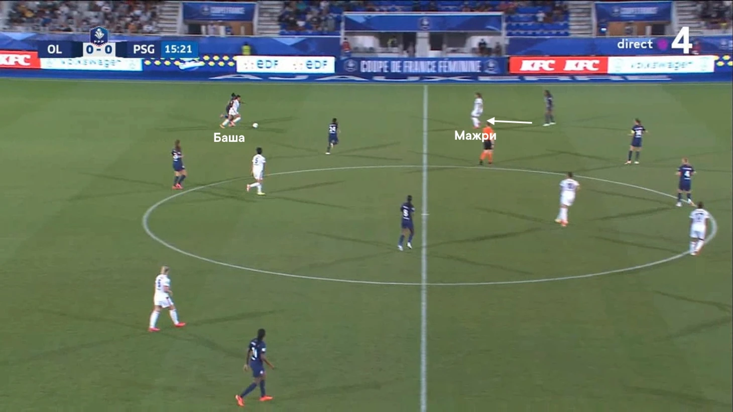 Без мяча «Лион» прессинговал по схеме 4-4-2. Марожан поднималась на одну линию с Пэррис и контролировала Паредес. Остальные разбирали прямых оппонентов: