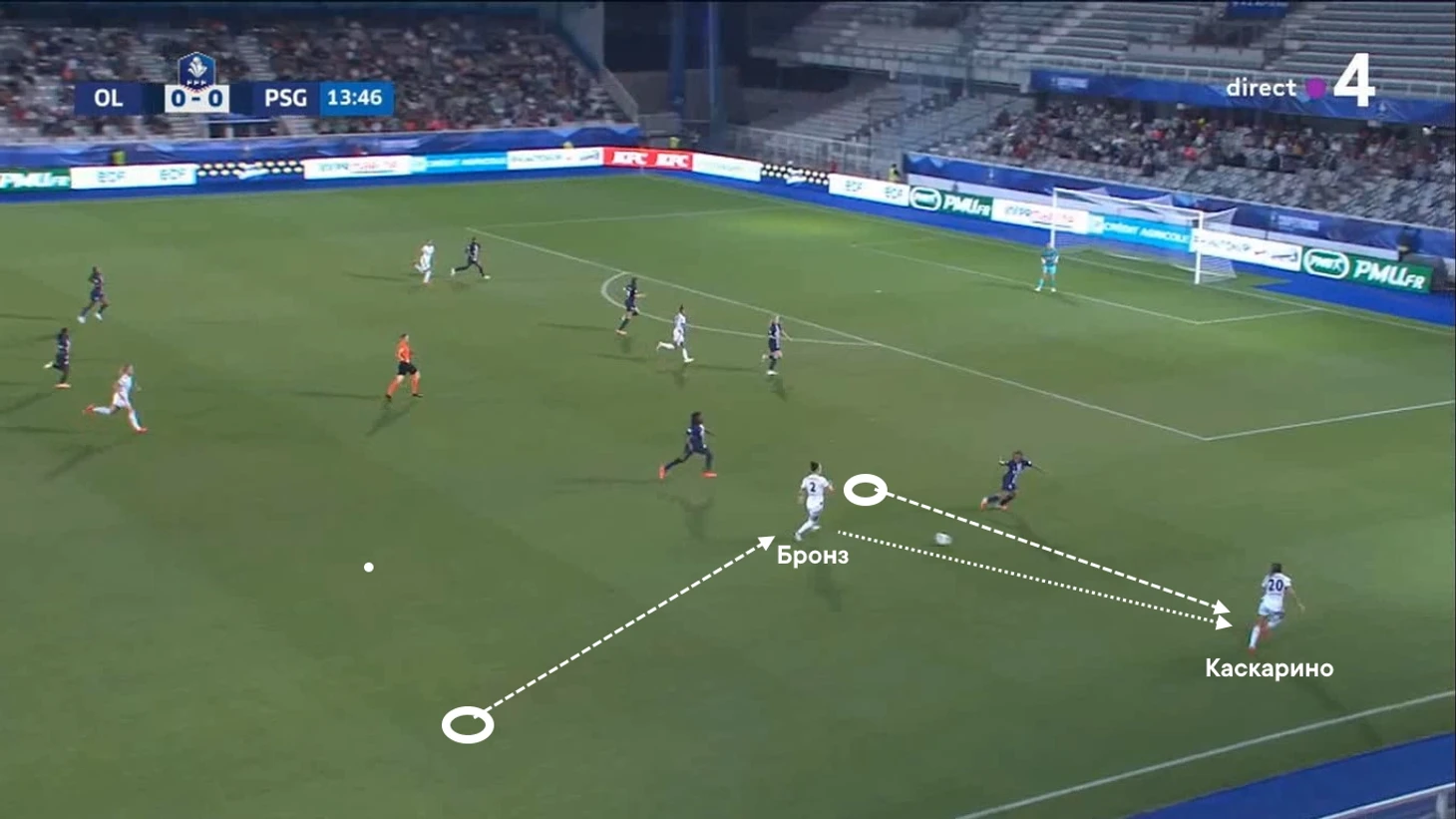 В подавляющем большинстве случаев (до выхода Ле Соммер на 62-й минуте) «Лион» использовал для атак правый фланг, на котором действовала пара Бронз–Каскарино. Футболистки здорово перемещались друг относительно друга. Если Бронз тащила мяч вперёд по флангу, Каскарино смещалась в полуфланг. Наоборот, когда английская защитница перемещалась ближе к центру, француженка располагалась шире. То есть игроки не отнимали друг у друга пространство и создавали проблемы для обороны ПСЖ.