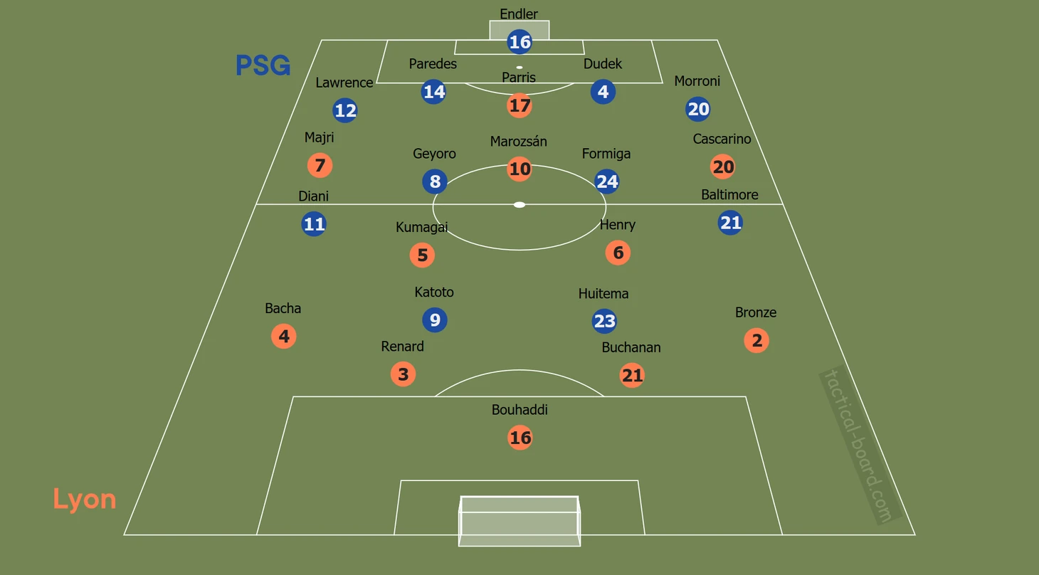 Наставник ПСЖ Оливье Эшуафни тоже сделал две перестановки. В центре полузащиты в паре с Гейоро вышла не собирающаяся заканчивать карьеру 42-летняя бразильянка Формига. В полуфинале против «Бордо» (2:1) тренер доверил эту позицию другой бразильянке, новичку команды Луане. Нападающая Надия Надим осталась в запасе, на её место переместилась Жордин Хайтема, которая с «Бордо» играла на правом фланге полузащиты. В старте вышла Сэнди Балтимор: