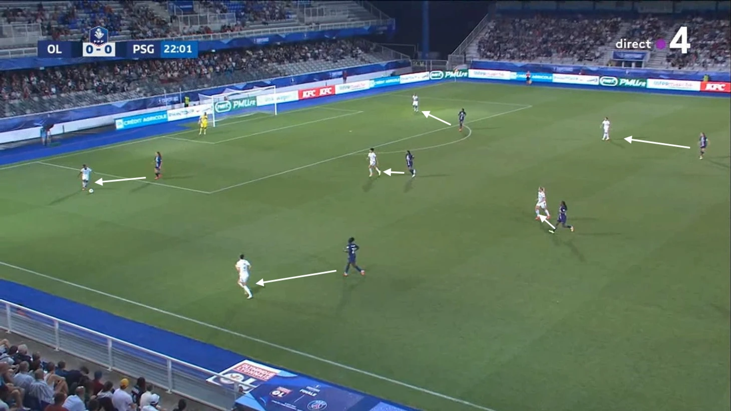 В этом эпизоде Люси отходит с мячом ближе к полуфлангу, а её партнёр, соответственно, перемещается на бровку, где может спокойно принять передачу. Левый защитник ПСЖ Перле Моррони не может контролировать обоих соперников: