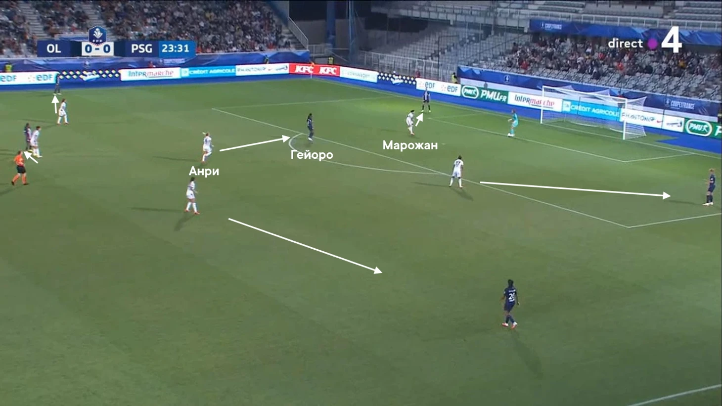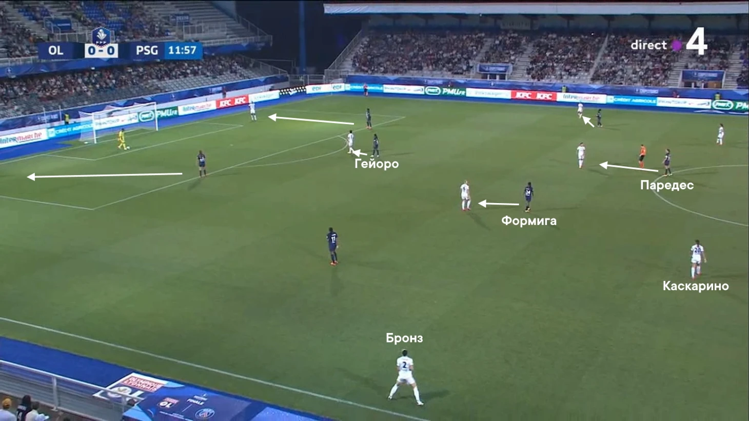 Когда «Лиону» нужно было вводить мяч в игру от вратаря, ПСЖ менял структуру, поднимался выше, подстраивался под схему соперника и выжидал момент для начала давления. Пара нападающих играла против пары центрбеков, Гейоро уходила из опорной зоны далеко вперёд за Кумагаи, Формига оставалась и контролировала Анри, а на Марожан из центра обороны выдвигалась Паредес: