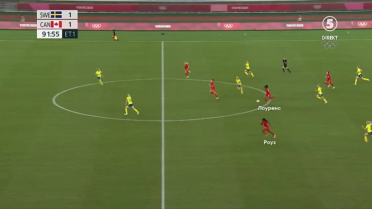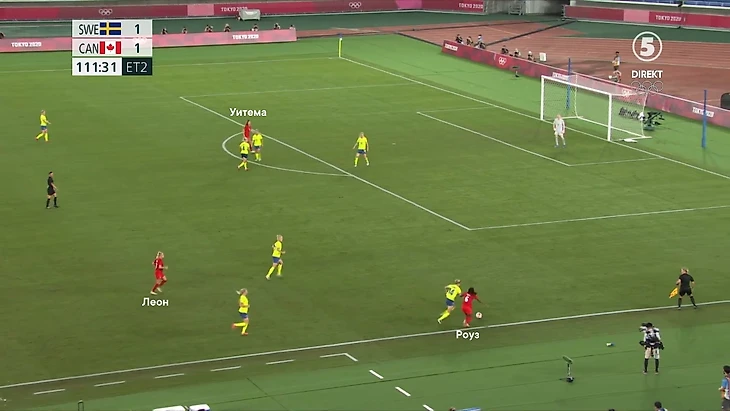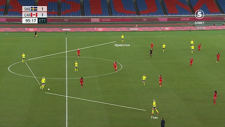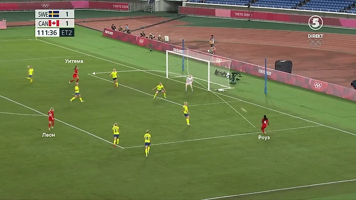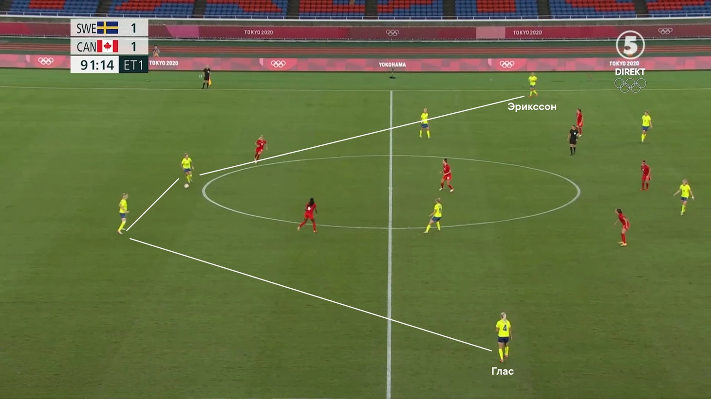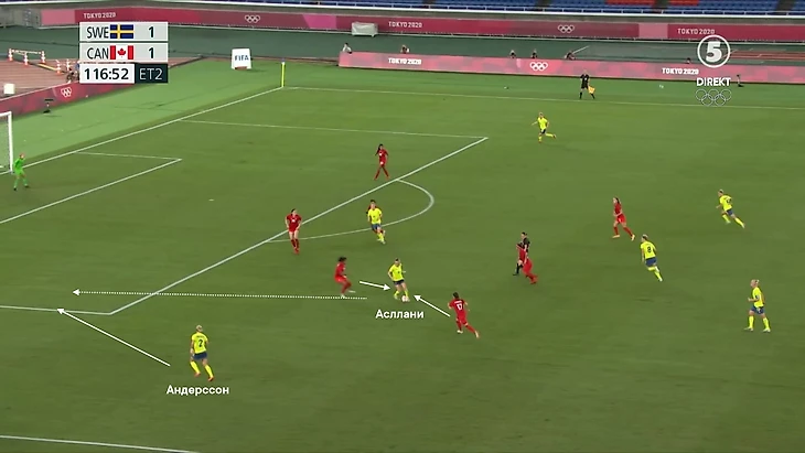 Скандинавки изо всех сил пыталась забить. Уставшие канадские защитники постоянно ошибались, обороняясь позиционно, а Герхардссон к тому же выпустил двух свежих атакующих игроков – Анну Анвегорд и Оливию Скуг. Лина Уртиг, вышедшая по ходу второго тайма, создала два явных момента, но не реализовала, Косоваре Асллани продолжала невероятно полезно действовать, отыграв все 120 минут. Здесь она стягивает на себя двух соперников и освобождает пространство для Андерссон: