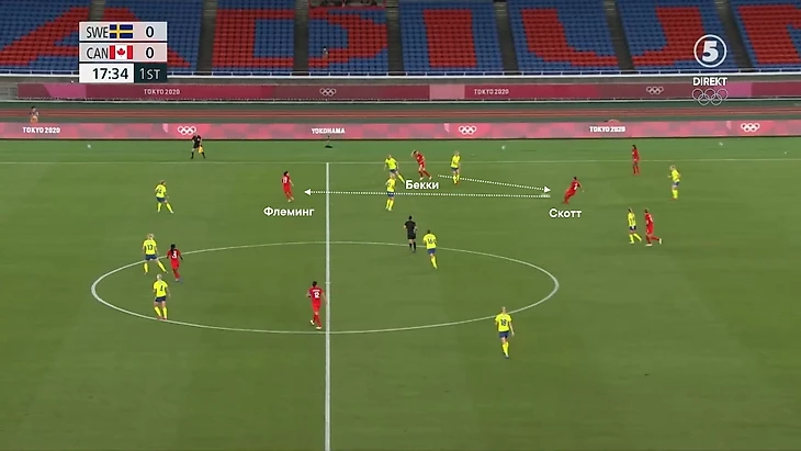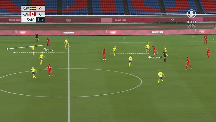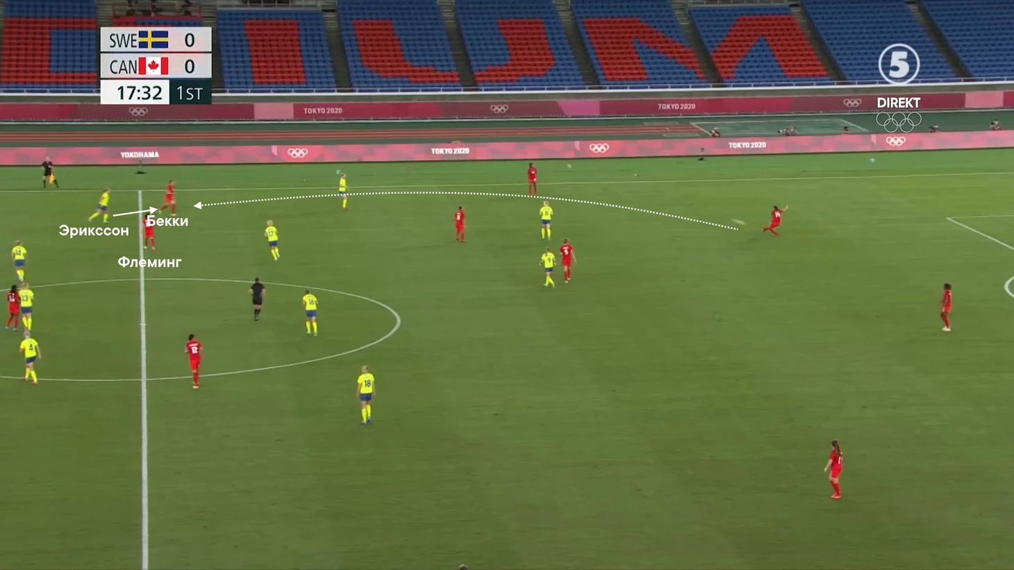 Защитники Швеции тоже выдвигались для давления, при этом в последней линии всегда оставалось минимум три игрока против двух соперников. Формально в таком сценарии у «жёлто-синих» есть преимущество, но канадки могли на этом поймать. И здесь снова вспоминаем про Джесси Флеминг. Она здорово двигалась без мяча и читала эпизоды. Здесь она ловит выдвижение Эрикссон на Бекки...
