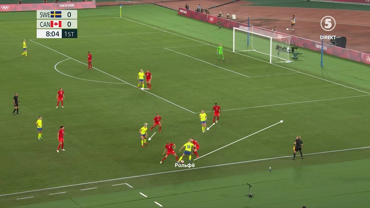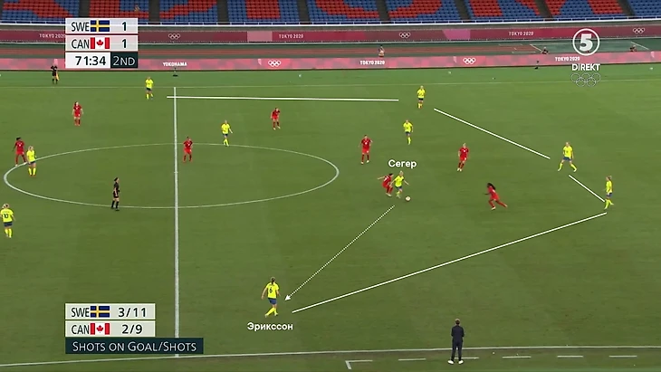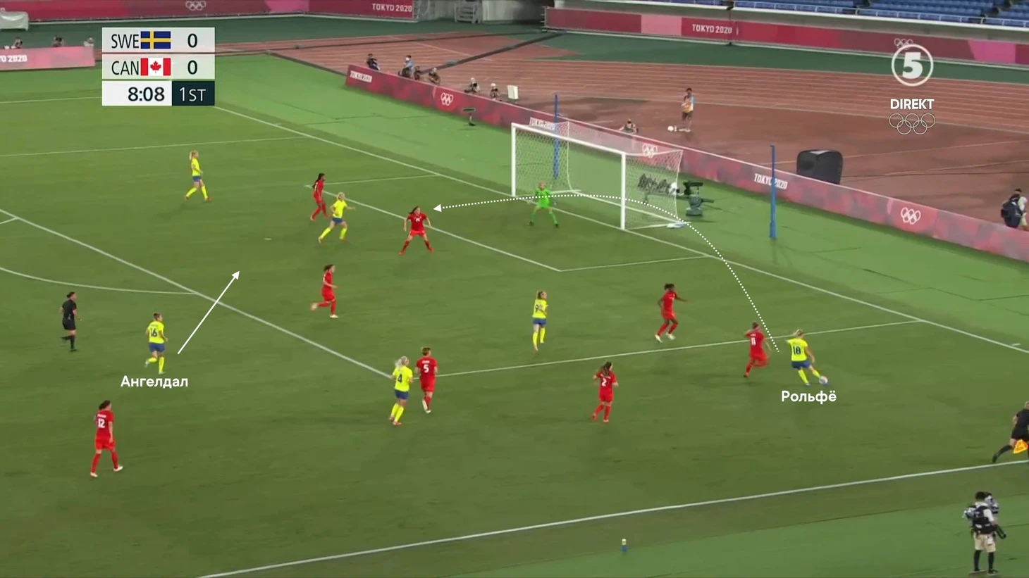 Швеция очень дисциплинированно играла без мяча, не неслась в прессинг с первых минут, но и не давала возможностей войти на свою треть (и даже на половину) поля. А при перехвате мяча здорово атаковала. Главная проблема заключалась в том, что канадки почти всегда создавали численное преимущество в зоне мяча, и шведкам нужно было вывозить атаки на индивидуальном мастерстве. Основной вариант создания моментов для скандинавок – кроссы с левого фланга. Фридолина Рольфё обыгрывает двух соперников и навешивает во вратарскую, мяч отскакивает к Ангелдал, которая пробивает без сопротивления: