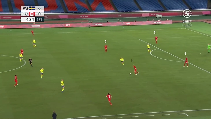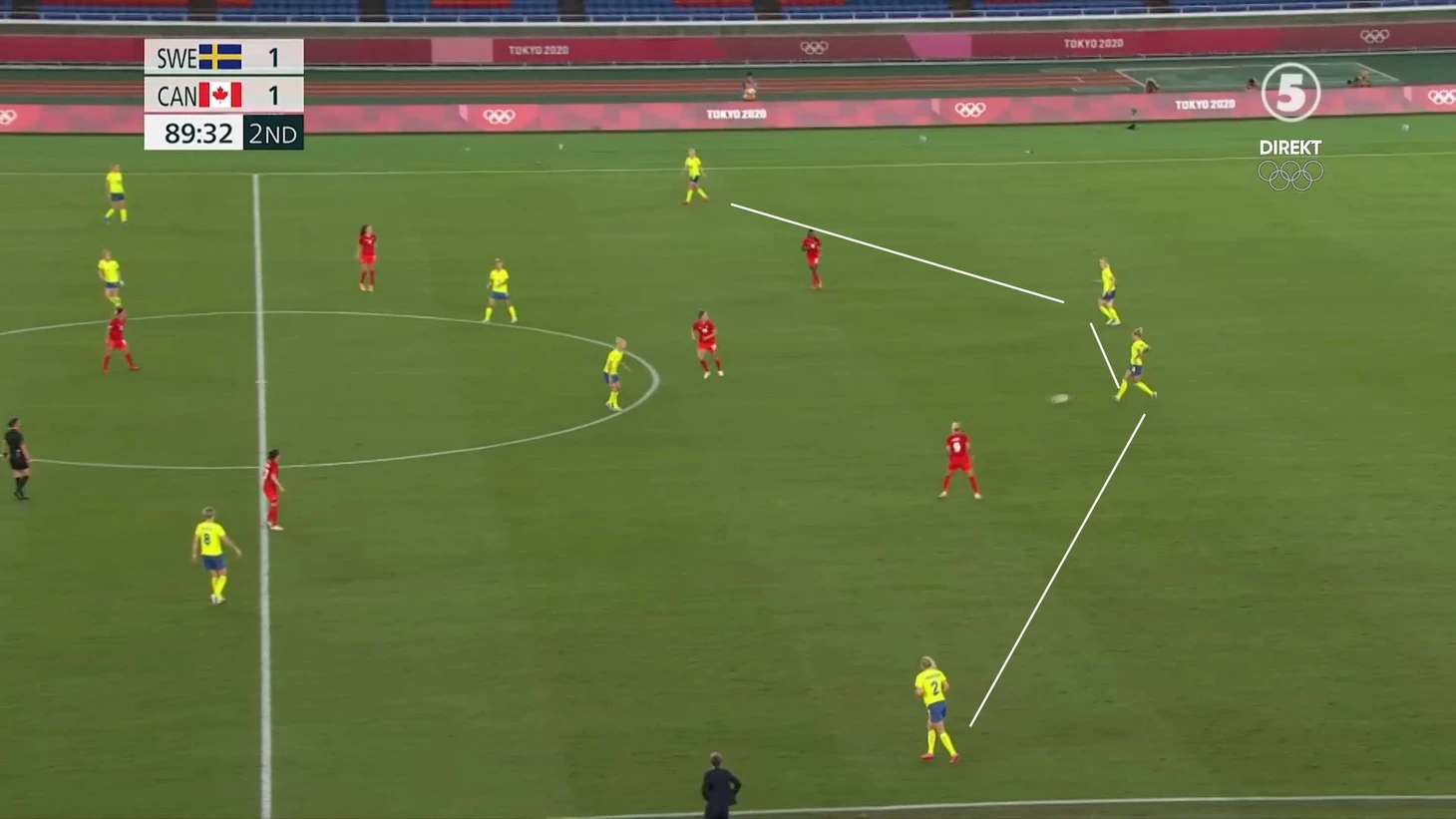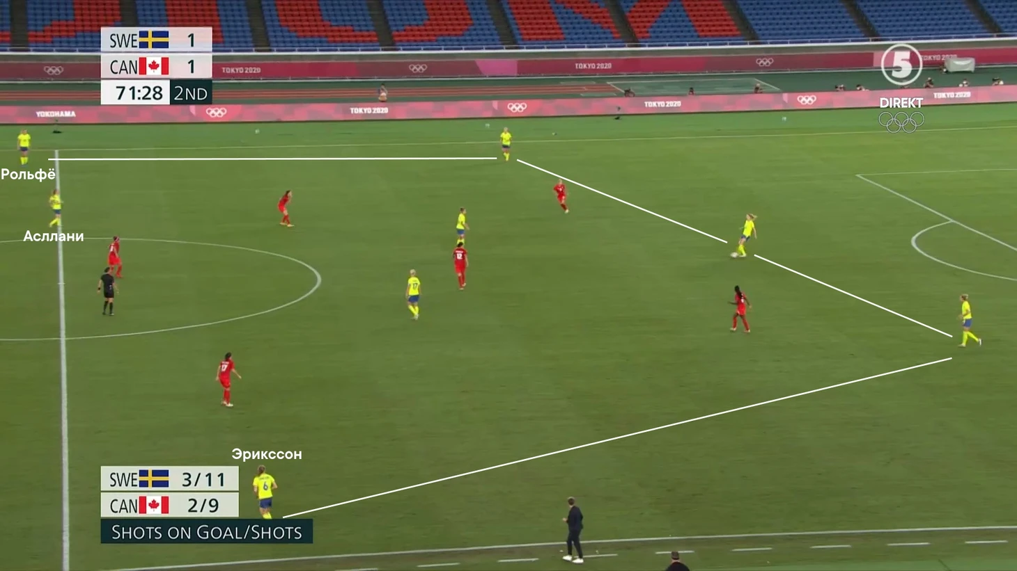В середине у Канады всё ещё преимущество (4-в-3) из-за схемы, но фланги остаются свободными. Сегер стягивает на себя соперников и отдаёт передачу на Эрикссон. Эпизод завершится неопасным ударом Асллани: