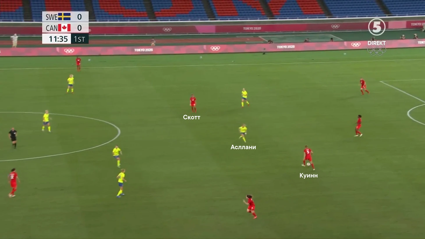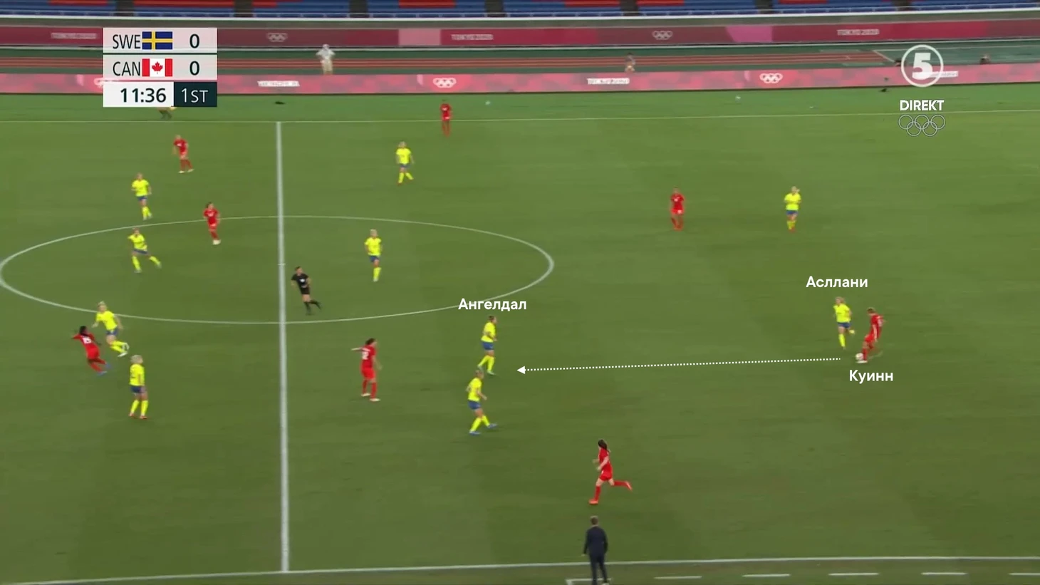 При таком крене в сторону обороны Канада предлагала несколько способов розыгрыша. Первый разобрали выше – плохой вариант; натыкаешься на шведскую стенку и без вариантов для продвижения теряешь мяч. Куинн долго выбирает решение с мячом, Асллани уже спешит её накрывать: