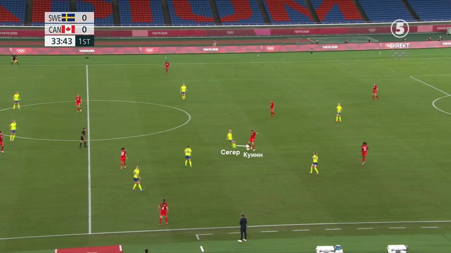 Шведки не прессинговали высоко, но активно вступали в отбор при пасах в опорную. В эпизоде с голом всё началось именно с выдвижения Сегер на Куинн: