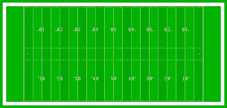 Вот так схематично выглядит поле для американского футбола. Прямоугольники по краям без отметок – зачетные зоны. На само поле наносится разметка, которая помогает понять, на каком удалении от зачетных зон сейчас идет игра.