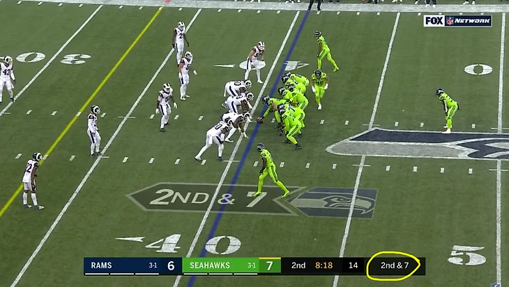 Мяч у команды в салатовом. Об этом говорят 2 детали: стрелка, наложенная на поле, и желтая тонкая метка на табло около названия команды. Надпись 2nd&7 говорит о том, что у команды сейчас начнется вторая попытка, а до обнуления осталось пройти 7 ярдов. Стартовая линия розыгрыша показана синим цветом (на самом поле), а линия обнуления – желтым.