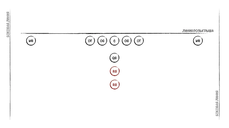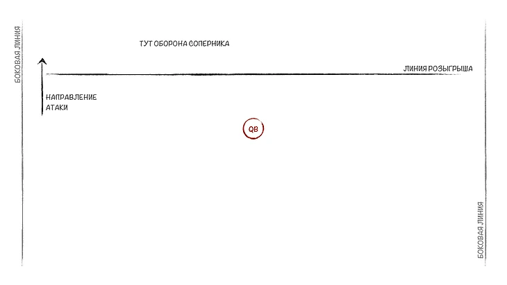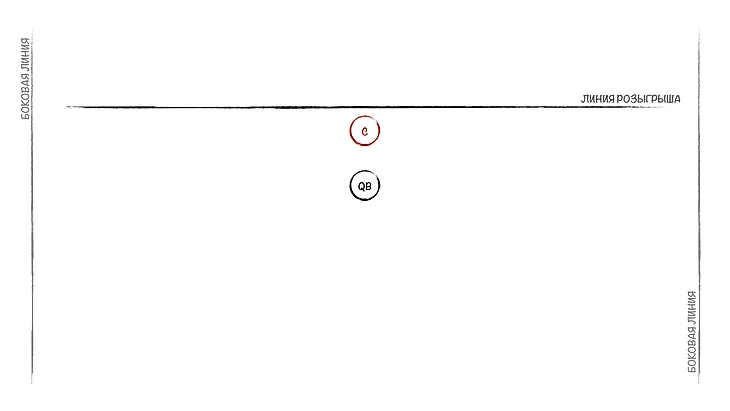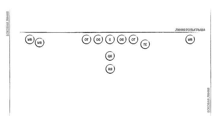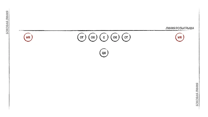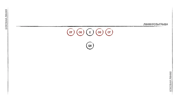 Но вот понимать, как строится атака в американском футболе, надо. Предлагаю вместе собрать атакующую линию, по очереди набирая игроков под разные нужды. После появления очередной позиции я буду на схемах показывать, где кто располагается. Сразу скажу: я буду рассматривать классические роли и позиции, их можно увидеть в подавляющем большинстве розыгрышей. Конечно, команды иногда могут выдумать что-то очень необычное, что не вписывается в шаблон. Но об этом пока не стоит думать, если вы новичок. Короче, погнали собирать команду.