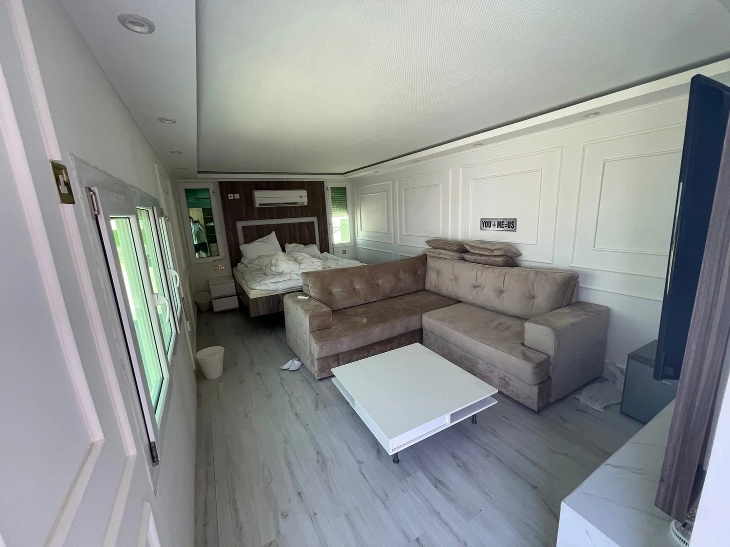 И теперь в нашем распоряжении большая гостиная с телевизором, который показывает футбол. Большая кухня, в которой помимо очевидной электроники есть еще и стиральная машина. А также спальня и душ с туалетом: лакшери невероятное.
