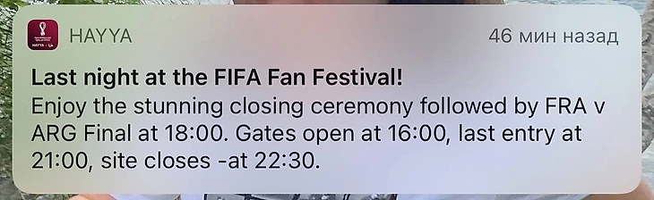 Наш последний день на ЧМ начался с раннего пуш-уведомления от ФИФА: фан-зона откроется в 16:00.