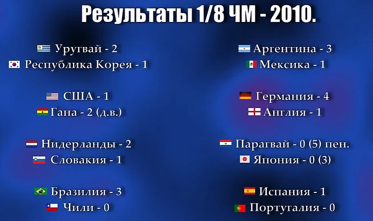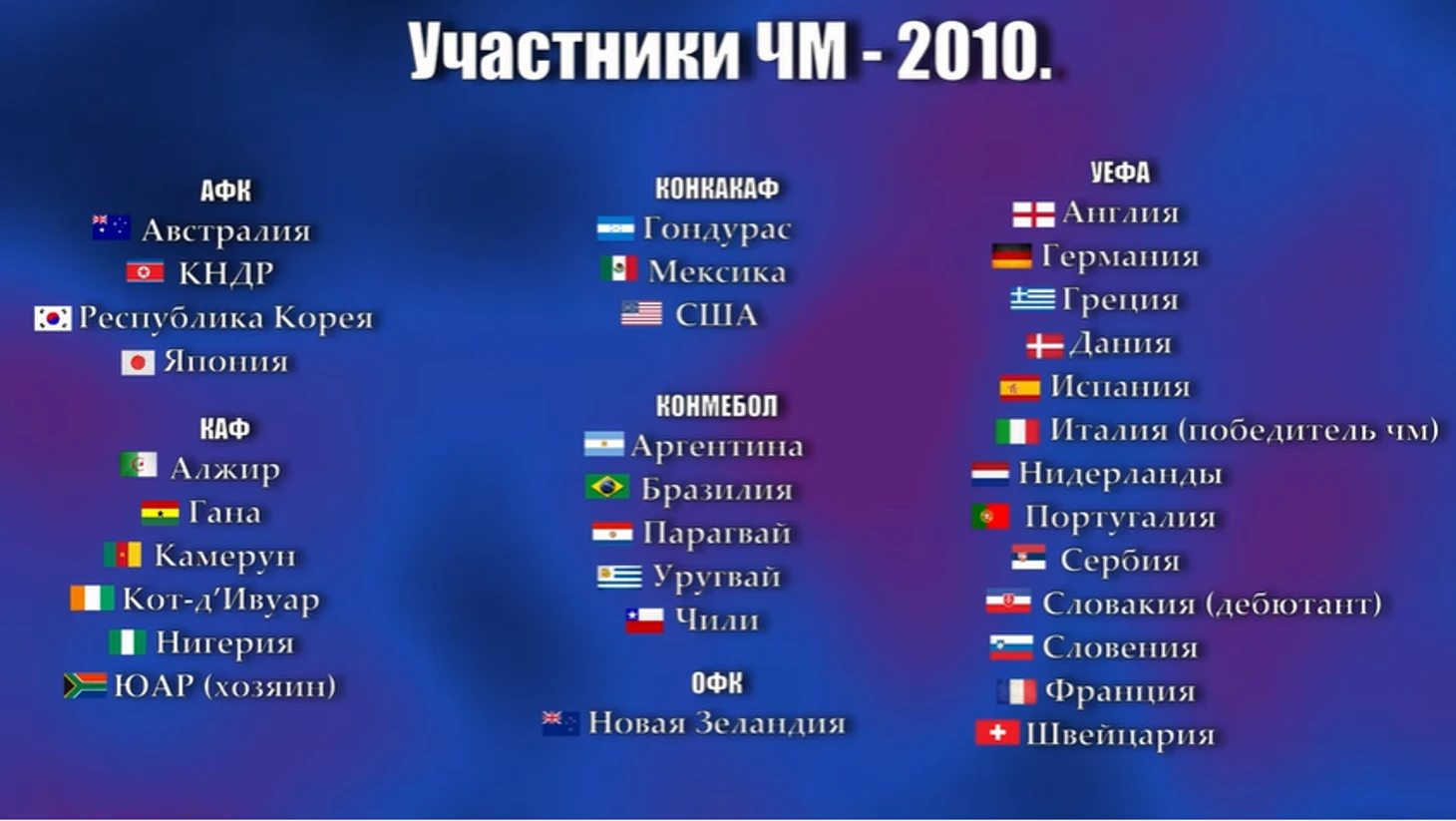 Кстати в финальной части турнира также не обойдётся без части тела, которой играть нельзя. Друзья, вот так планомерно мы добрались уже до 19-ого кубка мира в истории. Чем же он запомнился? Давайте вспоминать. Вашему вниманию статья о Чемпионате Мира 2010 года. Поехали.