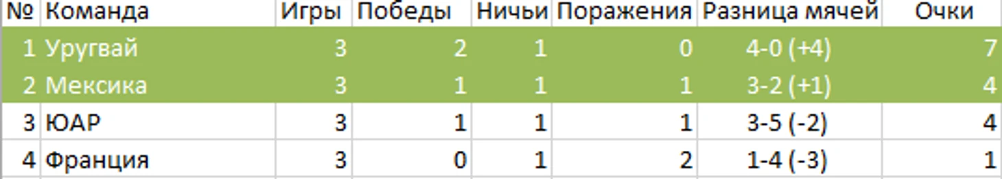 Уже в самой 1-ой игре турнира зрители могли насладиться танцем сборной ЮАР после гола Шабалалы, да и в целом группа 1 не дала скучать никому. А всё потому, что сборная Франция заняла последнее 4-е место, не победив ни разу. Видимо трёхцветным воздалось за игру рукой Анри в ранее упомянутом матче с ирландцами.