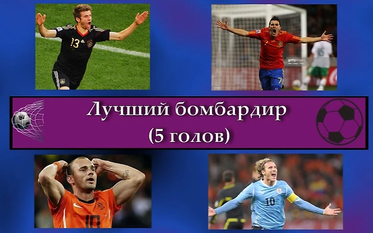 В списке лучших бомбардиров Чемпионата Мира 2010 года сразу четверо футболистов заняли 1-ое место. По 5 голов забили: Томас Мюллер, Давид Вилья, Уэсли Снейдер и Диего Форлан.