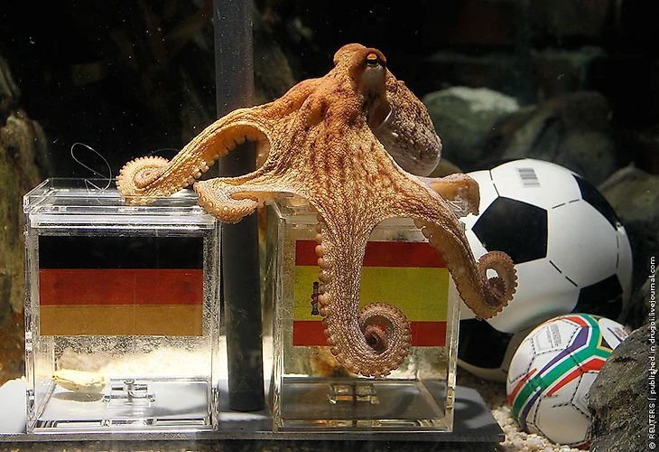 Кроме того, у мундиаля 2010 года был и свой прогнозист причём не из мира людей, а из мира животных. Речь про легендарного осьминога Пауля. Пауль безошибочно предсказал все результаты сборной Германии, а также победу Испании над Голландией в финале. За успехи в прогнозировании Паулю была подарена копия Кубка мира по футболу.