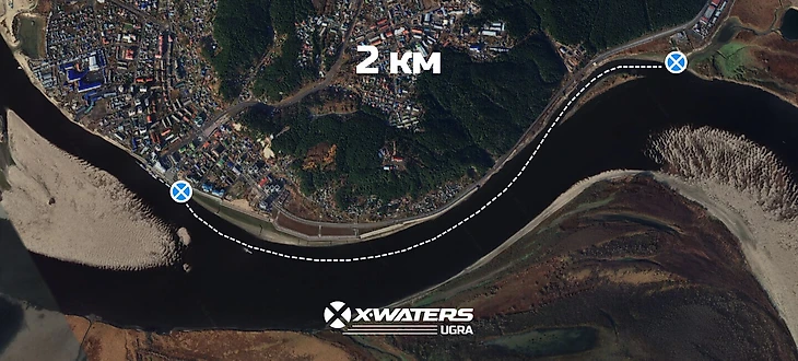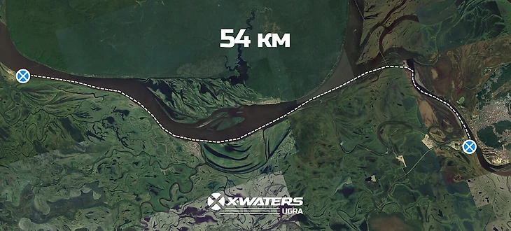 Река течет справа налево, поэтому старт заплыва справа, а финиш в Ханты-Мансийске – слева.