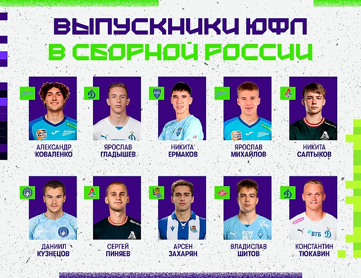 Ниже собрали для вас информацию о каждом из 20 игроков, которые после ЮФЛ надевали футболку национальной сборной.