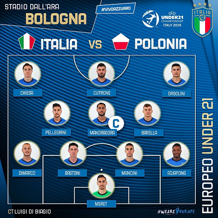 Итальянские эксперты перед матчем называли Польшу «веселой командой, играющей по схеме 4-3-3» - и они серьезно ошибались. Поляки вышли на поле застегнутыми на все пуговицы, выбрав стартовой расстановку 5-4-1. Естественно, это не могло не сказаться на зрелищности матча. У Италии были моменты, но по-настоящему опасный возник лишь на 21 минуте, когда Пеллегрини пробил выше. Вскоре после этого итальянцы и вовсе имели верный шанс: Кьеза откликнулся на прострел Аджапонга, но спас вратарь. В целом Италия старалась бить по воротам издалека - в центре все перекрыто, Кутроне не мог навязать борьбу всем полякам сразу.