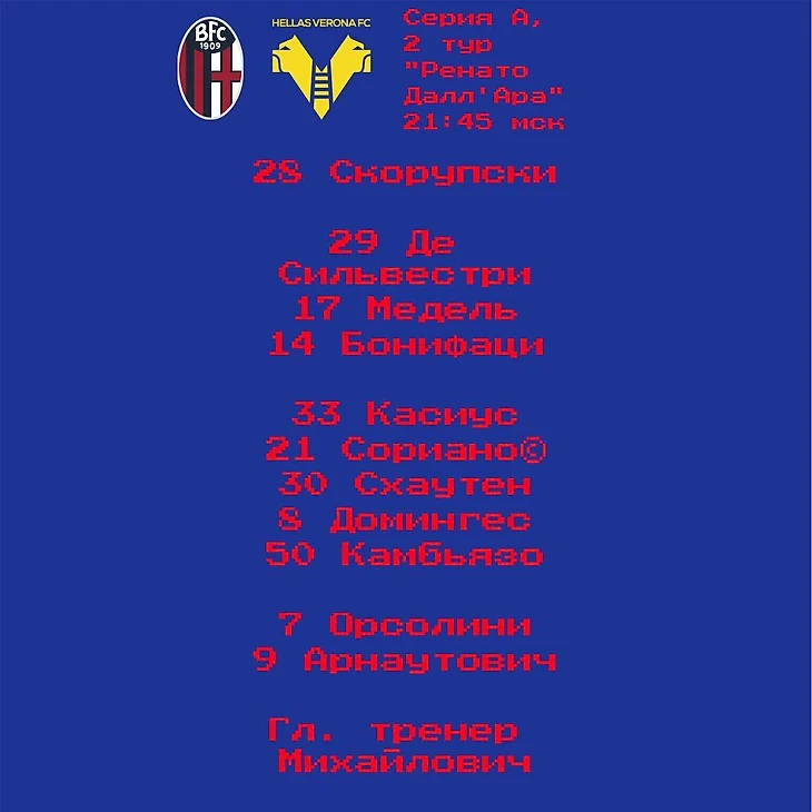Де Сильвестри впервые за все время в "Болонье" занял место в тройке центральных защитников. По бровке действовал Денсо Касиус, слева Камбьязо показался Михайловичу предпочтительнее Ликоянниса. Орсолини составил пару Арнаутовичу впереди.