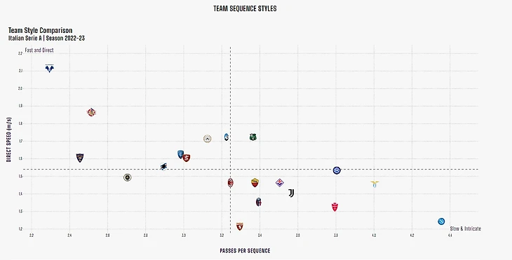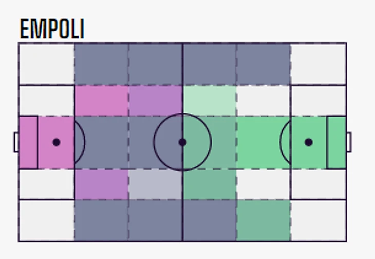 Игроками в системе Дзанетти движет стремление максимально быстро доводить мяч до чужой штрафной. Легче всего это делать на скорости, нужна ширина для маневра, отсюда — низкий показатель активности прессинга на чужой. Также обращаем внимание на график, демонстрирующий количество касаний "Эмполи" и их соперников в определенных зонах поля по сезону.