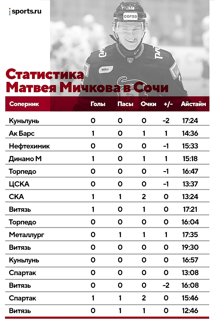 Отдавая Мичкова в аренду, СКА определенно рассчитывал получить назад окрепшую молодую звезду, способную брать игру на себя и добывать победы. Но в «Сочи» Матвей пока пока нестабилен – у него вполне неплохие 5+4 в 16 матчах, но заметен он далеко не всегда.