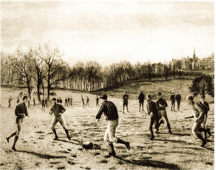 Томас М. М. Хеми. «Школа Хэрроу на футбольном поле», 1887 год (Работа является акварельной репродукцией, а сам оригинал был написан Уолтером Коксом за несколько лет до этого)