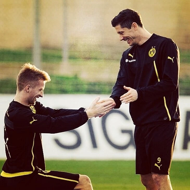 На этом фото Марко Ройс делает предложение своему польскому партнеру по команде. Он предлагает ему остаться в «Боруссии», но Левандовски все же решит переехать в Мюнхен.