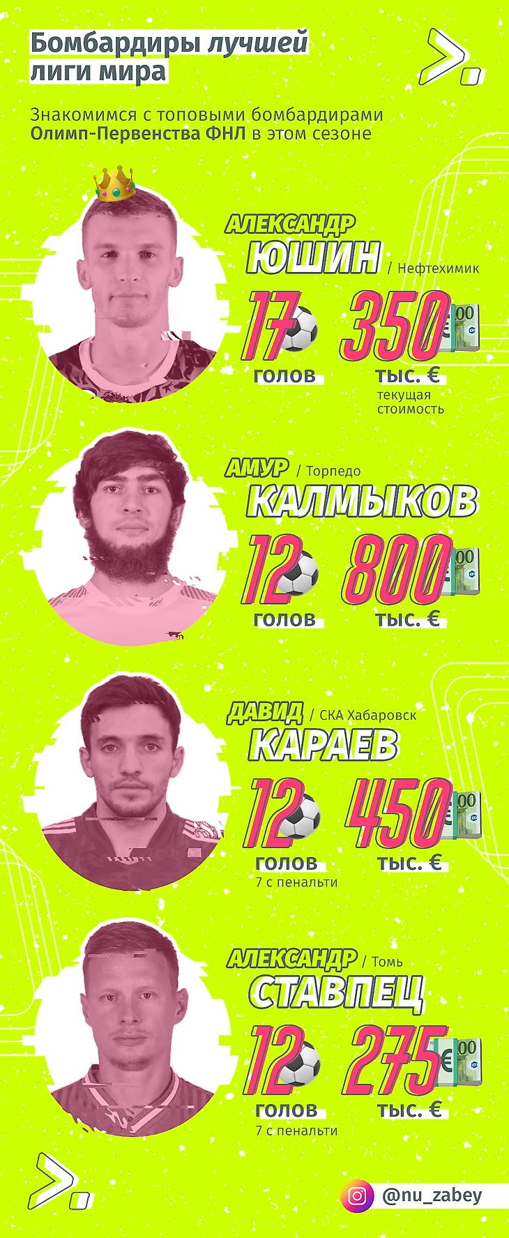 Сезон в Олимп-Первенстве ФНЛ в самом разгаре, а эти парни делают его ещё ярче. При этом ещё 6 игроков забили более 7 мячей и вполне могут побороться за звание лучшего бомбардира по итогам сезона.