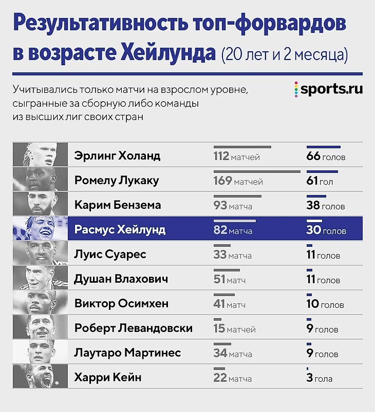 Тщательный анализ игры Роналду и собственный талант привели к тому, что в 2023 датский форвард идёт в топе лучших нападающих по забитым мячам, а в возрастной категории у Расмуса конкурентов и вовсе нету. Датчанин выделяется даже среди выдающихся предшественников: из девяток, покорявших топ-лиги в последние десять лет, только трое забили больше в аналогичном возрасте – Холанд, Лукаку и Бензема.