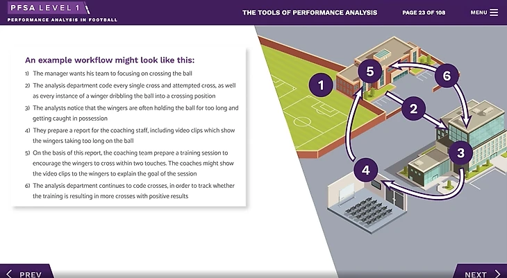 Курсы состоят из двух уровней: Level 1 – 5 курсов, посвященных поиску талантов, техническому скаутингу, анализу оппонента и индивидуальному анализу игроков. Каждый из них – это отдельная презентация, просмотрев которую, нужно пройти тест и набрать минимум 80 процентов правильных ответов. Информация в этих презентациях достаточно базовая и лишь поверхностно вводит в каждую из тем, но будет полезна тем, кто задумывается о карьере в скаутинге и не имеет широкого представления об этой работе. Мне, например, было удобно подсмотреть разные типы софта для кодировки матчей и обработки видео, а также узнать недельный цикл работы аналитического отдела в Англии – со следующего сезона я буду создавать такой отдел в Тасмании для первой команды.