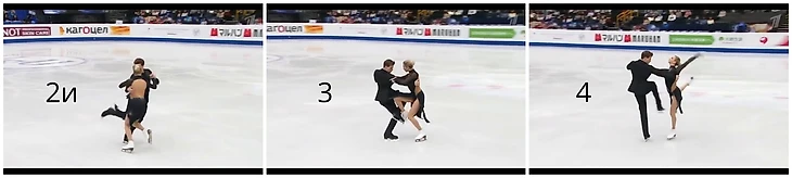 Приведенный фрагмент «свободен» от обязательных элементов танца, так что его структура полностью на совести хореографа. С точки зрения музыкального строения, одна и та же фраза повторяется (точно или с небольшими изменениями) 4 раза, все время с той самой ритмической пульсацией, о которой я рассказал выше. Эта ритмическая сетка четко отражается в движениях танцоров, особенно в первом и последнем проведениях фразы, где акценты на 2и, 3 и 4 акцентируются движениями ног (махами, сгибами ног в коленях итд.; на стоп-кадрах ниже показаны оба фрагмента):