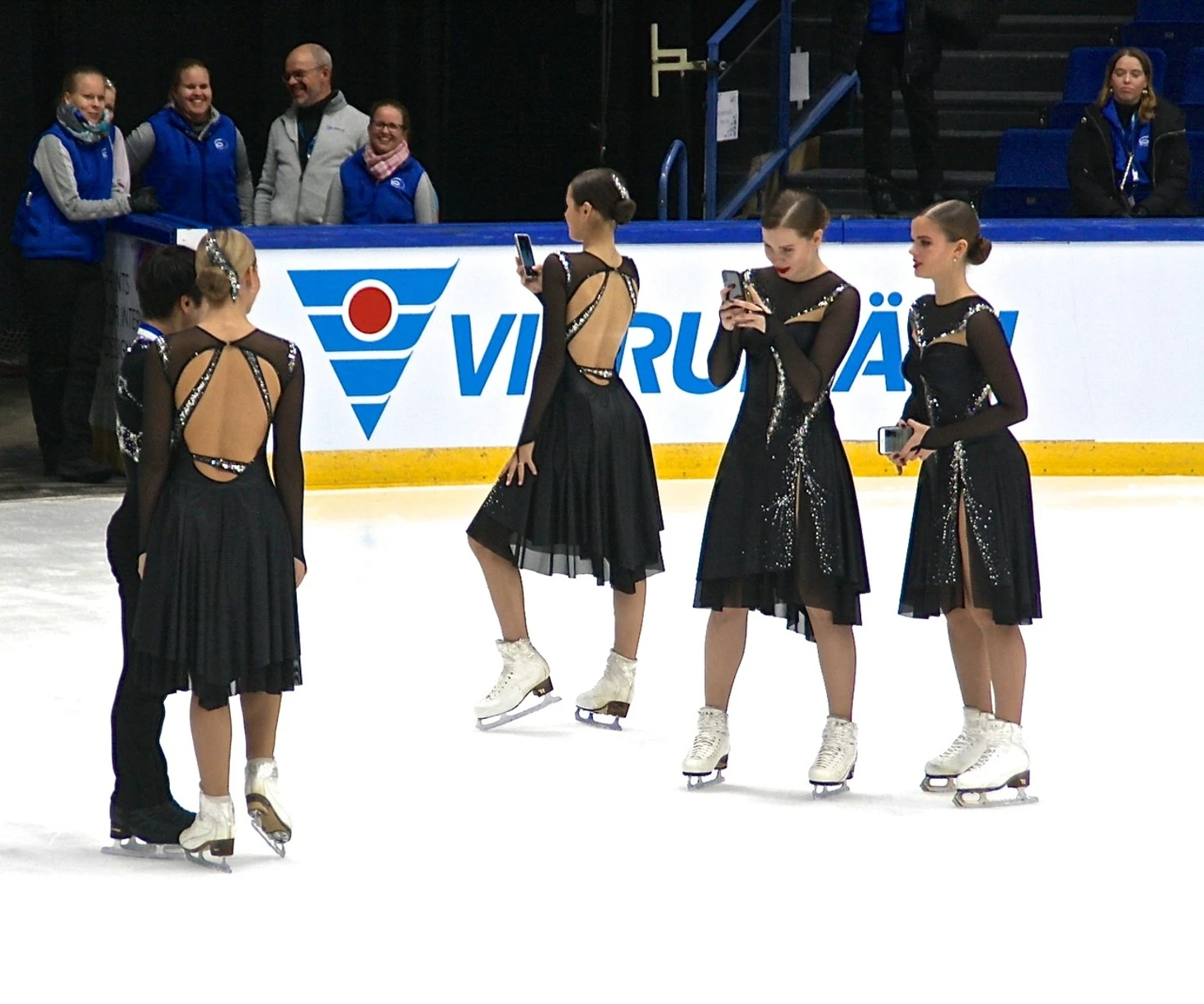 В обзорах этого турнира, вышедших после его окончания, нет ни одного слова о турнире по синхронному катанию. Между тем, для местной публики именно это событие определенно стало кульминацией вечера субботы. К началу соревнований на каток пришло несколько групп болельщиц, которые с началом прокатов активизировались и принялись голосить кричалки и активно махать флагами своих команд. Атмосфера накалилась и начала напоминать скорее футбольный матч, нежели фигурное катание. Для меня такой интерес стал в некотором роде откровением, хотя о наличии сильных финских команд я, конечно, знал (и пару команд даже как-то наблюдал вживую на небольшом турнире в Зальцбурге). В этот раз финских команд было вж четыре, а победила… наша команда Парадиз.