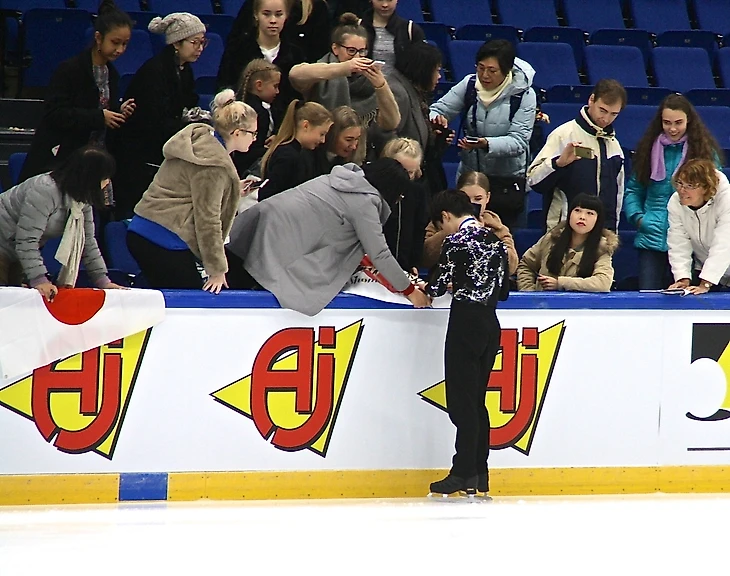 Диктор стадиона несколько раз призвала фигуристов покинуть лед, но только уже когда на льду появилась машина замбони, все стали постепенно расходиться. Шома еще раз съездил к дальнему борту, порадовал детей своими автографами и улыбками