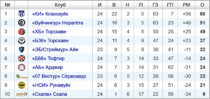 Лучшие бомбардиры: Ватнамар («Вуйчингур») – 18 голов; Бьярталуй («КИ») – 14 голов; Клеттскар («КИ») – 13 голов