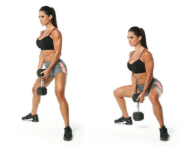 Самый простой вариант выполнения — с гантелей в руках. Техника выполнения остается аналогичной классическому варианту или любому другому, в руки нужно взять дополнительный вес. Опускаясь — гантеля в руках должна опуститься вниз, между ногами. Поднимаясь — вернуться в положение перед собой. Можно взять две гантели в обе руки.