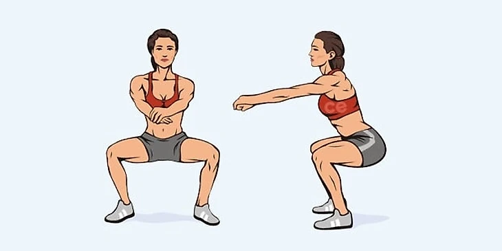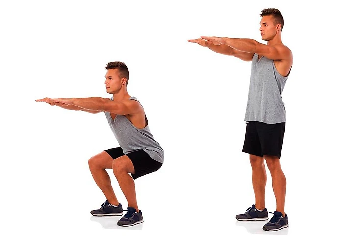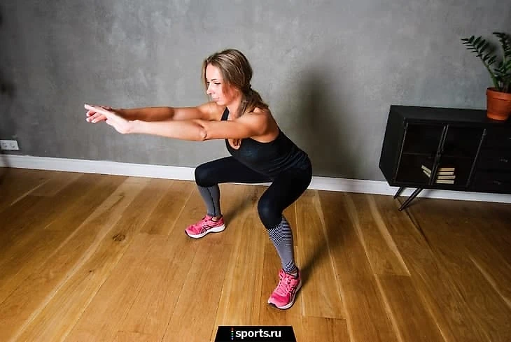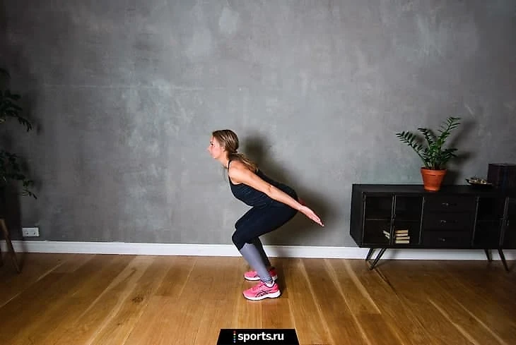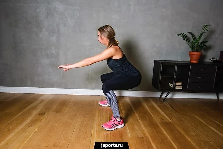 Бедра должны быть параллельны полу. Чтобы это сделать, нужно согнуть колени и не наклонять корпус вперед. Как будто садиться на невидимый стул.