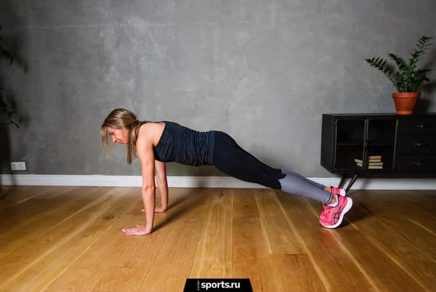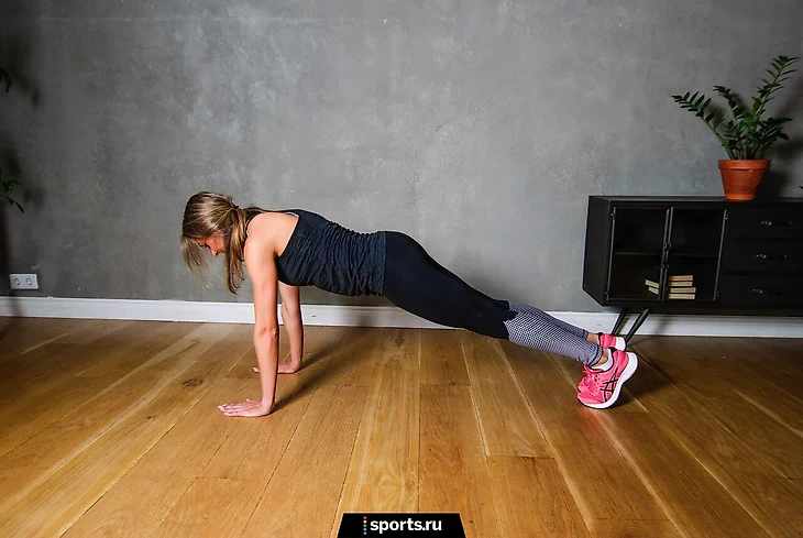 Выполняется оно из исходного положения «планка». Нужно лечь на пол, упереться ладонями и носками ступней в пол, поднять корпус так, чтобы спина, таз и плечи находились на одной прямой линии.