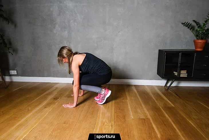 Затем снова присесть, упереться руками в пол, ноги вернуть в исходное положение.