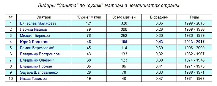 Пожалуй, одним из главных героев вчерашнего матча «Зенита» с «Ахматом» стал голкипер петербуржцев Юрий Лодыгин, неоднократно спасавший свою команду и в итоге оставивший свои ворота «на замке». Для него это была уже 46 игра «на ноль» за «Зенит» в чемпионате России, и он обогнал по этому показателю Романа Березовского, на счету которого 45 «сухих» матчей. В списке всех зенитовских вратарей Лодыгин поднялся на 4 место, и теперь выше него располагаются только Легенды клуба: Вячеслав Малафеев, Леонид Иванов и Михаил Бирюков. А вот по среднему количеству «сухих» матчей Юрий среди всех вратарей, сыгравших за «Зенит» в чемпионате страны больше 50 матчей, является единоличным лидером.