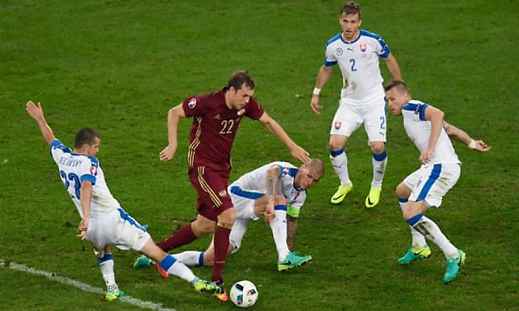 Мы подошли к второму матчу против Словакии в позитивном настроении, и эта игра являлась возможностью оформить выход в следующий раунд. Опять Леонид Слуцкий в стартовом составе выпустил Александра Кокорина, Артёма Дзюбу и Федора Смолова, и Роман Нойштедтер и Александр Головин страховали оборону. Мы начали игру положительно, и Фёдор Смолов был близок к голу с ударом из дальней дистанции.