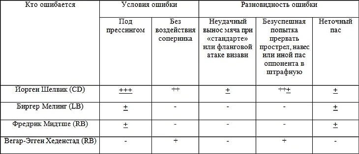 Проблемы в обороне подопечных Коре Ингебригтсена выливаются также в невольно самостоятельно созданные дефами «Русенборга» опасности у собственных владений. Интересно, что наиболее слабым в данном плане звеном защиты тронхеймцев выступает Йорген Шелвик. У него, как и партнёров стоппера по оборонительной линии, нередко возникают ошибки под прессингом визави, да и, как говорится, просто «на ровном месте». Ознакомиться с разновидностями помарок Йоргена и партнёров, их частотой да условиями появления можно из приведённого ниже блока информации: