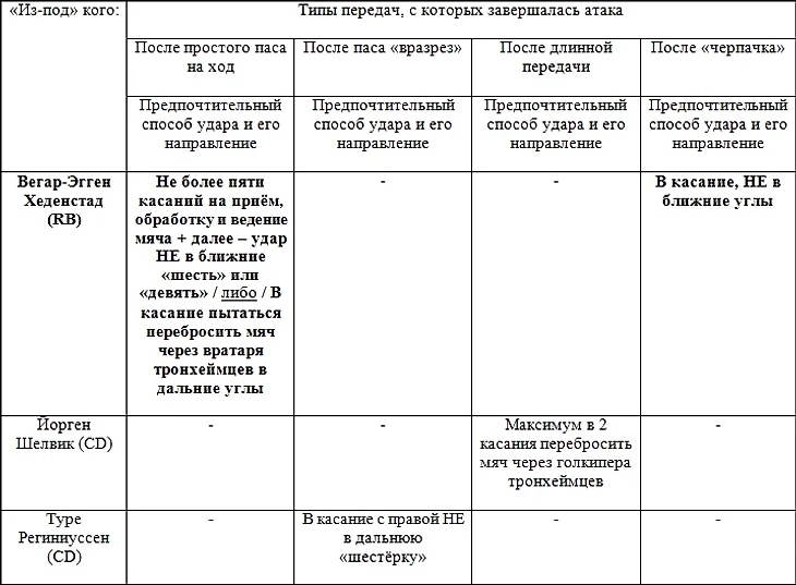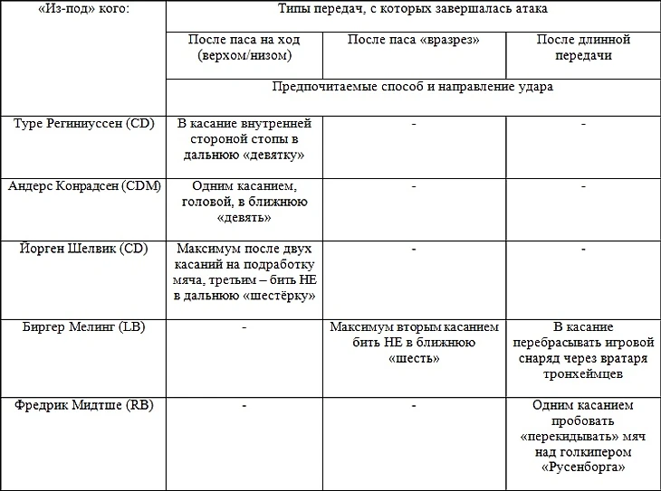 Первые же удобнее производить, освобождаясь от «надзора» Мариуса Лундему и Биргера Мелинга. Чуть менее действенные «разрезающие» передачи да продолговатые переводы сподручнее делать в противостоянии с центрбэком Расмуссеном и капитаном команды Йенсеном соответственно. Сложнее составленные комбинации окончания изучаемого типа атак тщательнее описаны в следующей сводке: