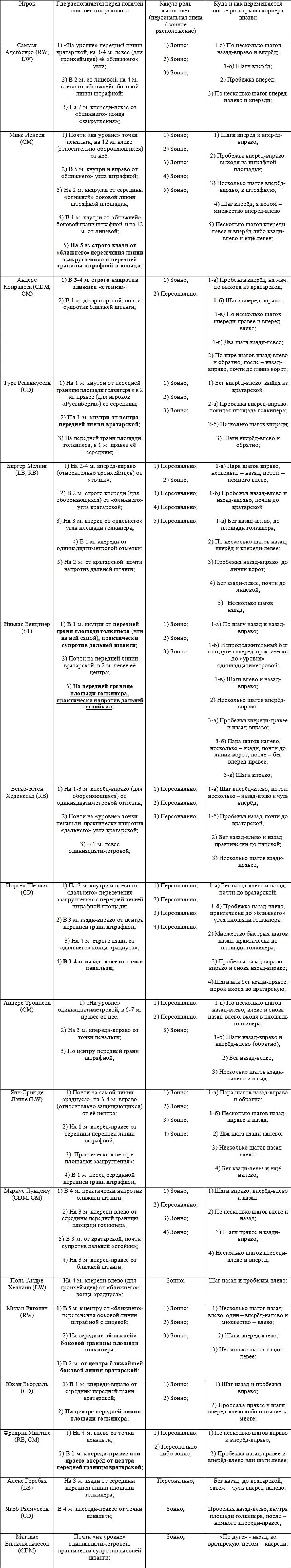«Из-под» каждого из них желательно головой пытаться перевести мяч в одну из «девяток» или ближнюю «шесть». В целом же все «тролли» до исполнения визави углового неравномерно распределяются по своей половине поля. Многие полевые (обычно 9 человек) находятся тогда внутри штрафной площадки, а оставшийся один (как правило, кто-то из вингеров) – за её пределами. Подробности о данных расположениях и перемещениях после этого всех игроков «Русенборга» отражены в такой вот таблице: