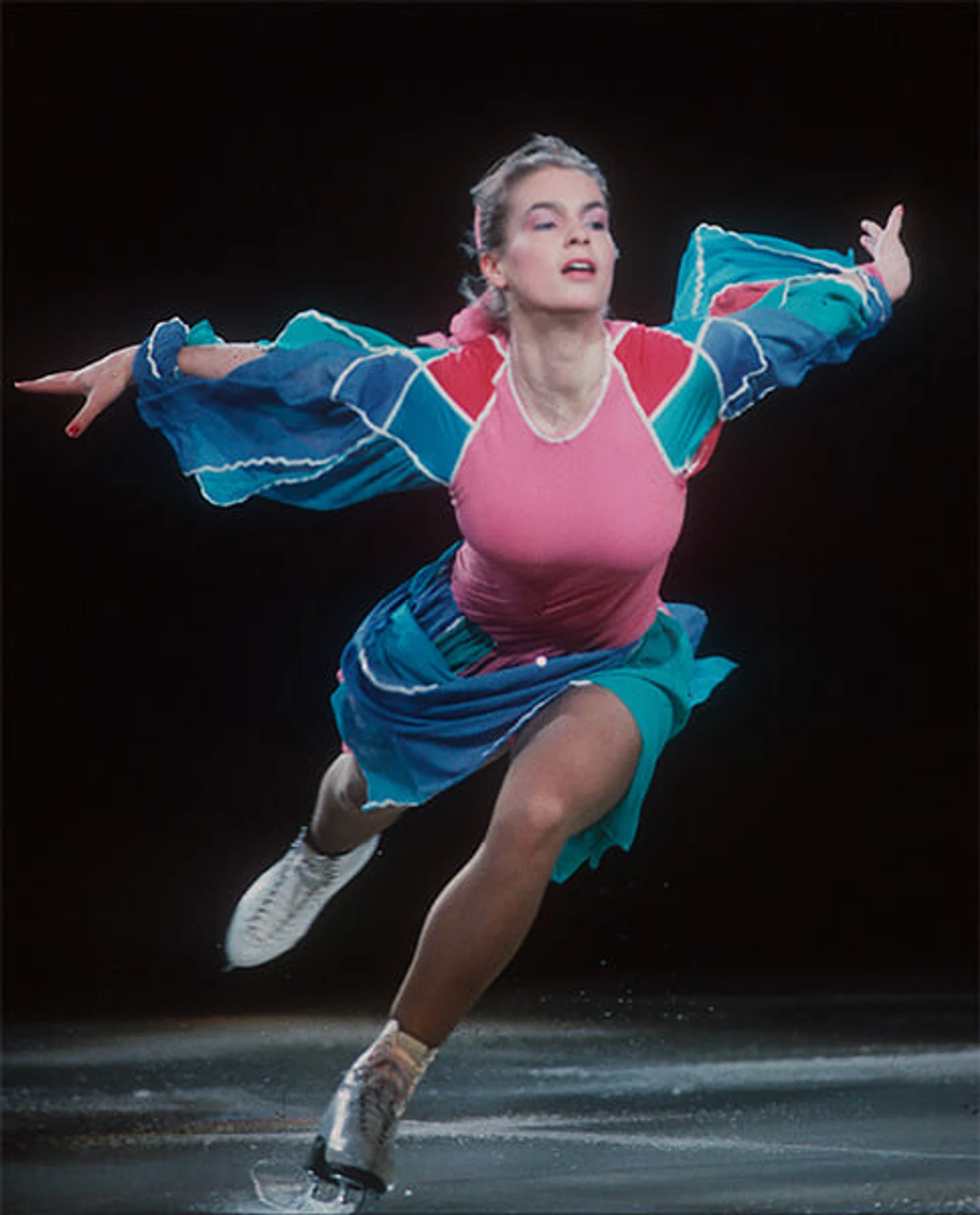 Авторитарный тренер Юта Мюллер выстроила процесс именно так, поэтому Витт на старте карьеры – это короткая, идеологически верная режиму ГДР стрижка и платье, которое уже надевала партнерша по команде.