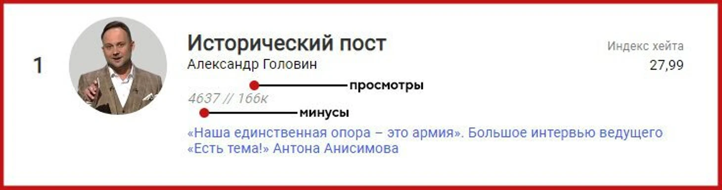 К примеру, у интервью Анисимова 4637 минусов и 165659 просмотров. Тогда ИХ = (4637÷165659)*1000 = 27,99. По количеству минусов вторым должно быть «Заявление Sports.ru по поводу новостей об Артеме Дзюбе» – но у поста 225 тысяч просмотров, поэтому 14-е место по ИХ.
