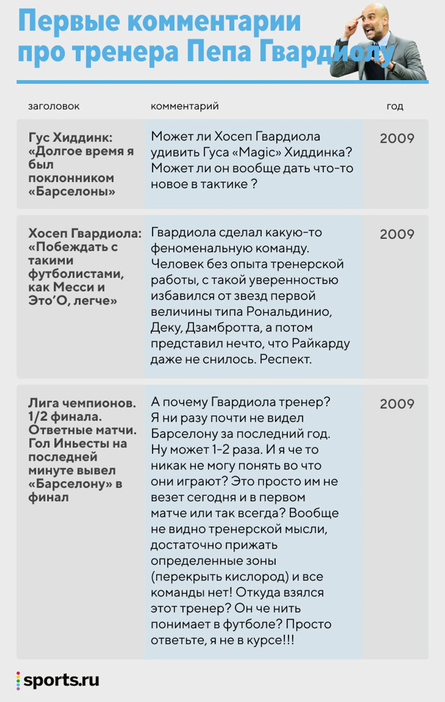 Здесь сомневаются в способностях начинающего тренера Пепа Гвардиолы («Вообще не видно тренерской мысли. Он что-нибудь понимает в футболе?»), называют 20-летнего Сидни Кросби хоккейным Бексом («Много пиара из ничего») и даже вангуют переезд Месси в США к Бекхэму («Если сорвется переход в «Зенит»!)